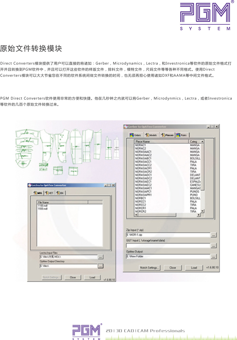 PGMDirectConverters軟件使用非常的方便和快捷。他在幾秒鐘之內(nèi)就可以將Gerber,Microdynmics,Lectra,或者Investronica等軟件的幾百個原始文件轉(zhuǎn)換過來。