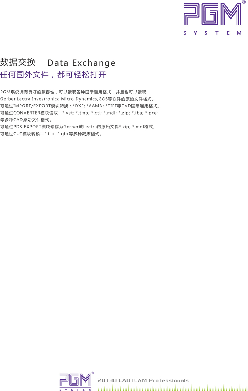 PGM軟件中的Import/Export模塊,可以接駁當今世界上絕大多數(shù)的CAD系統(tǒng)文件,并且保證數(shù)據(jù)的穩(wěn)定傳輸。PGM可以接駁的文件格式包括了:DXF,AAMA,ASTM,NC,HPGL,HPGL-2,MicroJet等。