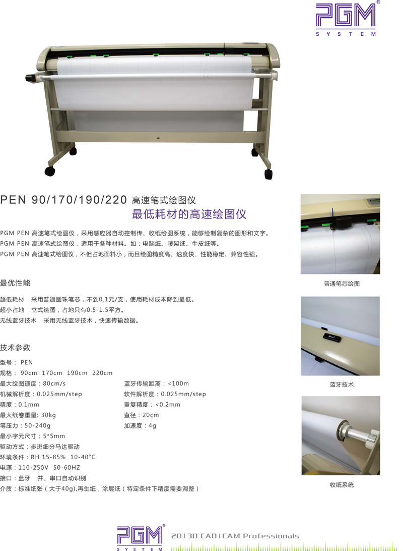 PGM Bigpen 筆式繪圖機(jī),采用感應(yīng)器自動控制傳、收紙繪圖系統(tǒng),能夠繪制復(fù)雜的圖形和文字。 適用于各種不同材料。包括,電腦紙,嘜架紙,牛皮紙等各種材質(zhì)的紙張,以及從30g到450g不等的各種厚度的紙張。不但造型美觀優(yōu)雅,而且繪圖精度高,速度快,性能穩(wěn)定,兼容性強(qiáng)(與HP-GL兼容)。