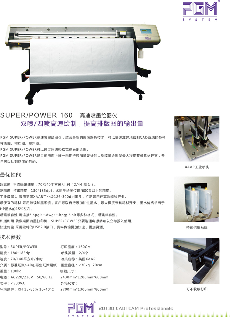 PGM SUPER 最新高速噴墨繪圖儀,是在 2007 年的良好基礎(chǔ)上,結(jié)合最新的圖像解析技術(shù)而推出的一款繪圖儀?梢钥焖,準(zhǔn)確的繪制 CAD 系統(tǒng)的各種樣版和排料圖。 全球化的生產(chǎn)趨勢(shì),集團(tuán)多工廠的生產(chǎn)。