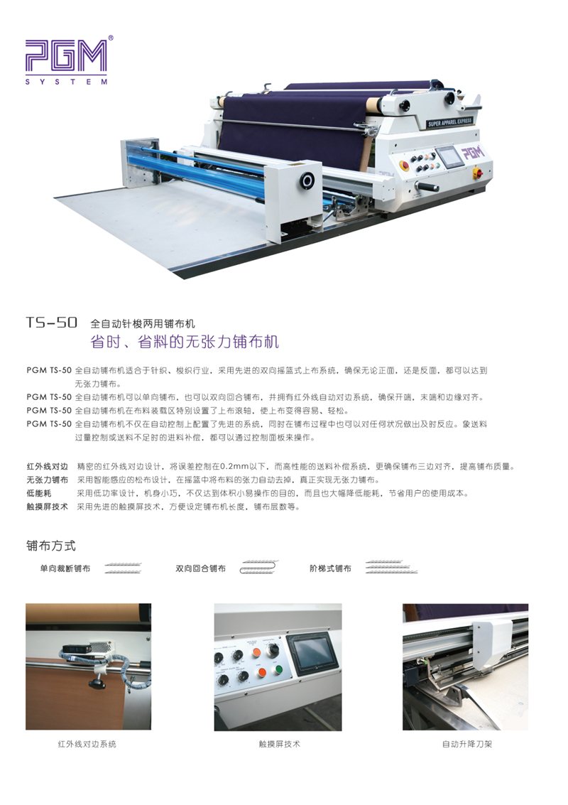 PGM TS-50全自動(dòng)拉布機(jī)采用先進(jìn)的觸摸屏技術(shù),方便設(shè)定鋪布機(jī)長(zhǎng)度,鋪布層數(shù)等,還采用雙向的搖籃式上布系統(tǒng),無(wú)論正反面都保證無(wú)張力鋪布。 PGM TS-50全自動(dòng)拉布機(jī)采用低機(jī)身設(shè)計(jì),便于裝載布料。送料過(guò)量或者不足時(shí),可通過(guò)補(bǔ)償控制面板進(jìn)行補(bǔ)償操作。