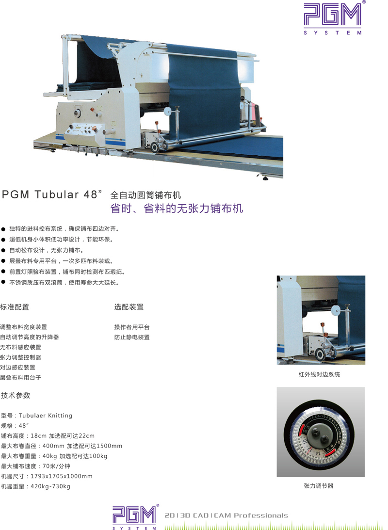 PGM TUBULAER KNITTING 全自動(dòng)鋪布機(jī)采用先進(jìn)的電子感應(yīng)器,自動(dòng)感應(yīng)鋪布狀態(tài),布料鋪完時(shí),自動(dòng)停機(jī)。 PGM TUBULAER KNITTING 全自動(dòng)鋪布機(jī)能夠根據(jù) PGM CAD 制定的排料長度和訂單要求來設(shè)定鋪布層數(shù),而且擁有層數(shù)自動(dòng)記錄功能,達(dá)到鋪布層數(shù)時(shí),會(huì)自動(dòng)停止。
