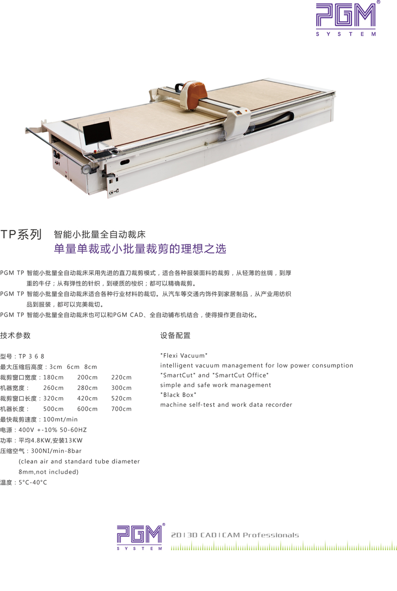 PGM TP3-6-8 全自動裁床機(jī) , 可以根據(jù)用戶的實(shí)際需要定制裁剪床的大小 , 并且任何長度的裁剪床都可以搭載全自動鋪布機(jī) 。