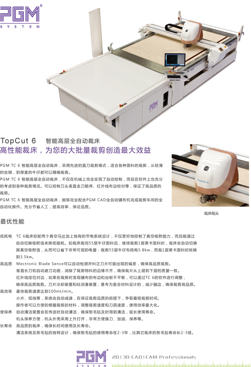 PGM TC6 全自動(dòng)裁床機(jī) , 采用先進(jìn)的直刀裁剪模式 , 適合各種不同面料的裁剪 , 從輕薄的絲綢 , 到厚重的牛仔 , 從棉織品,到 PVC 等涂層面料,從服裝行業(yè),到包袋,服飾,都可以精確的裁剪。