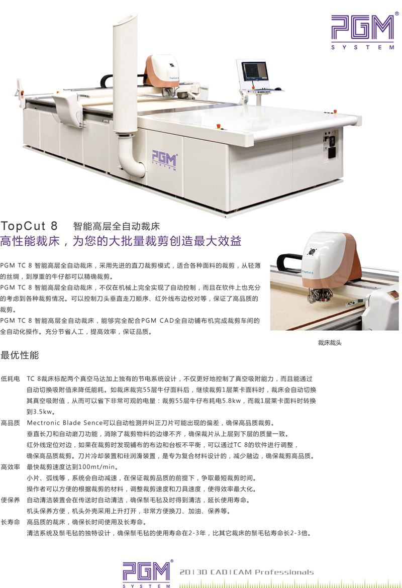 PGM TC8 全自動裁床機 , 采用先進的直刀裁剪模式 , 適合各種不同面料的裁剪 , 從輕薄的絲綢 , 到厚重的牛仔 , 從棉織品,到 PVC 等涂層面料,從服裝行業(yè),到包袋,服飾,都可以精確的裁剪。