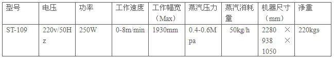 本機特點: 具有對布料預(yù)熱、蒸濕、冷卻定型全套功能,對布料進行理想預(yù)縮定型。 內(nèi)置進口電子調(diào)速器,速度任意調(diào)節(jié)。 蒸盤采用不銹鋼材料制造,防止銹蝕。 采用蒸汽加熱,蒸濕,熱力集中、耗氣少、省電。 配置精密計碼器,準(zhǔn)確記錄布匹數(shù)量。 配置萬向腳輪,移動方便。 配合人體操作高度需要,結(jié)構(gòu)合理,可適應(yīng)單人操作,占地面積少。 主要技術(shù)參數(shù):
