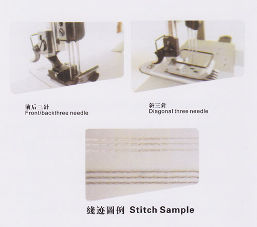 該機造型穩(wěn)得美觀,操作空間大。采用針桿挑線、彎針勾線,形成三針線跡,線跡美觀挺直,富有彈性,適用于不同縫線和面料的縫紉作業(yè),如中平布,卡其布和牛仔布料等,縫制效果好。并配備各種規(guī)格的尺寸針位產(chǎn)品可供選擇。