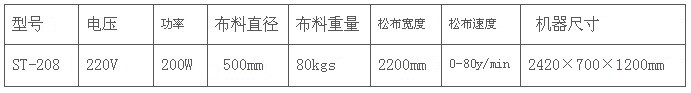 本機(jī)特點(diǎn) 1、自動(dòng)松布,有效消除卷裝布料之張力,且方便拉布。 2.滾輪及擺布器速度內(nèi)部已調(diào)節(jié)控制,容易操作. 3.具回布功能,可卷回有問題的布匹. 4.附移動(dòng)輪,移動(dòng)方便. 主要技術(shù)參數(shù):