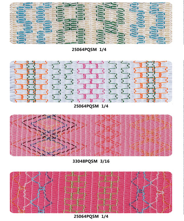 PQSM is the smocking stitch without lower thread machine. Because the upper stitch is sewing by elastic thread ,it is suitable for thin materials or light knitwear ,By combining various cams with ornamental thread,it is practicable to make varied attractive patterns.