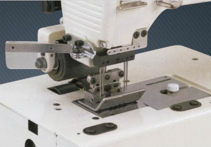 四針平臺型彎針橫向環(huán)縫鏈式褲腰縫紉機,后拖輪左右分開,便于轉彎縫。