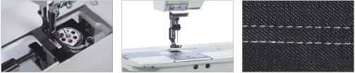 本機(jī)采用雙直針、立式自動(dòng)加油旋梭勾線,滑桿挑線,構(gòu)成二行雙線鎖式線跡。上下軸同步齒形帶傳動(dòng)。采用針桿擺動(dòng)與送料方式,旋鈕式標(biāo)盤節(jié)針距和杠桿式倒順?biāo)土蠙C(jī)構(gòu)。在梭芯內(nèi)的縫線回拉彈簧,保證底線與面線得到一致的縫紉效果。