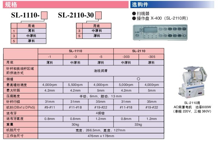 用于薄料/中厚面料/厚面料 最高縫紉速度:4,000-5,000 rpm 最大針距:4.2-5 mm 抬壓腳高度:6-13 mm