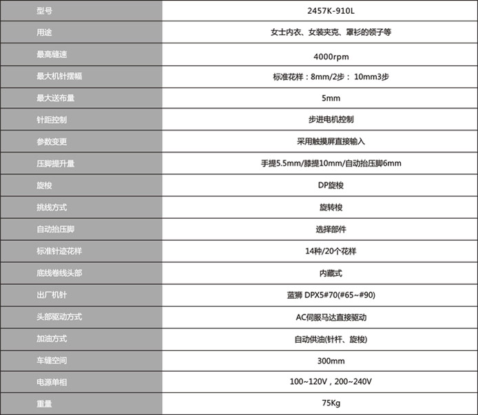 在一臺可對應(yīng)多樣化花樣縫的2457K-910L系列在標準規(guī)格、防