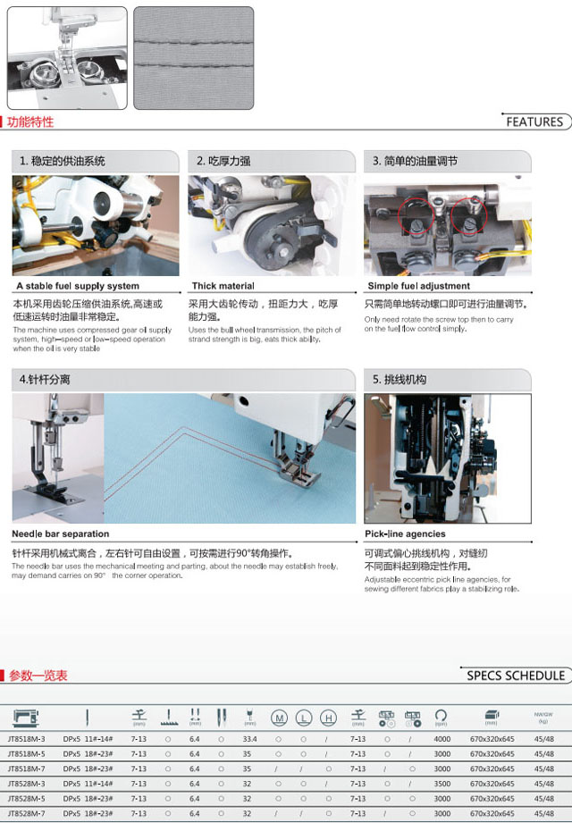 本機(jī)采用單針桿、立式自動(dòng)加油旋梭勾線,滑桿挑線,構(gòu)成二行雙線鎖式線跡。上下軸用滾珠軸承支承,同步齒輪形帶傳動(dòng);柱塞式油泵潤滑系統(tǒng)。采用針桿擺動(dòng)與送布牙同步送料方式,旋鈕式圓盤調(diào)節(jié)針距和杠桿式倒順?biāo)土蠙C(jī)構(gòu),在梭心內(nèi)的縫線回拉彈簧,保證底線與面線得到一致的縫紉效果,適用縫制大衣、制服、牛仔褲、包袋、裝飾縫等。