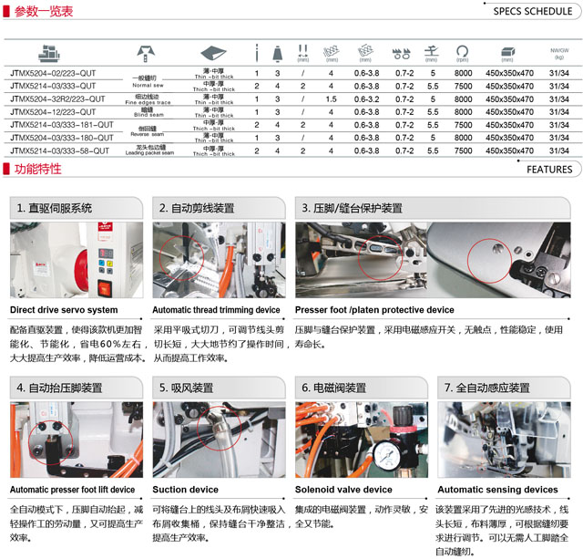 JTMX5200-QUT超高速包縫機(jī),最高縫速可達(dá)8000轉(zhuǎn);可自動(dòng)抬壓腳、加裝吸線及切線裝置,采用了電腦直驅(qū)內(nèi)置伺服馬達(dá)省電60%左右;在針桿、搖桿部位增設(shè)吸油裝置,避免漏油;單支撐針桿結(jié)構(gòu),易實(shí)現(xiàn)高速運(yùn)轉(zhuǎn);針桿機(jī)構(gòu)封閉防止灰塵吸入,防止針桿的磨損及漏油現(xiàn)象發(fā)生;加裝濾油器,提高油的清潔度,保證高速運(yùn)轉(zhuǎn);最大限度增加了操作空間,使操作更加舒適、方便、保證縫制線跡的優(yōu)美。
