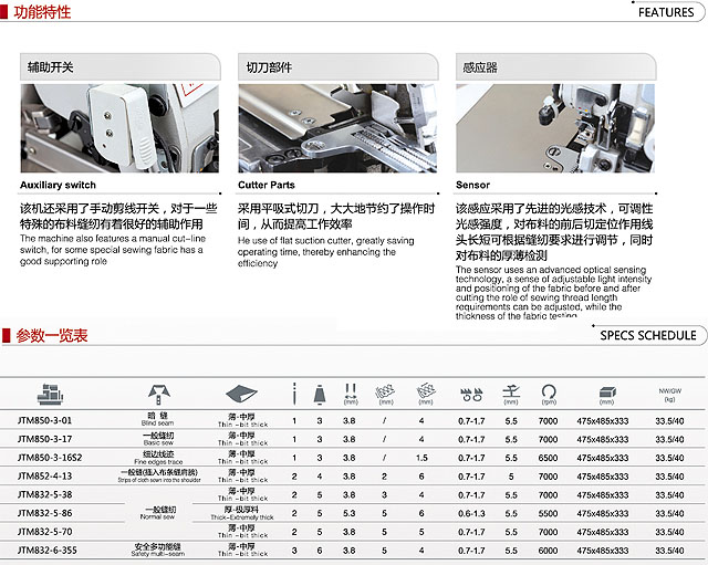 JTM800系列是改進(jìn)的基本型包縫機(jī),美麗的線跡和充實(shí)的附屬配件,維修方便,可廣泛滿足市場的需求;實(shí)現(xiàn)了控制溫度、噪聲、振動的高速旋轉(zhuǎn),提高了生產(chǎn)效率;油封效果好,保護(hù)縫制品不受油污染。
