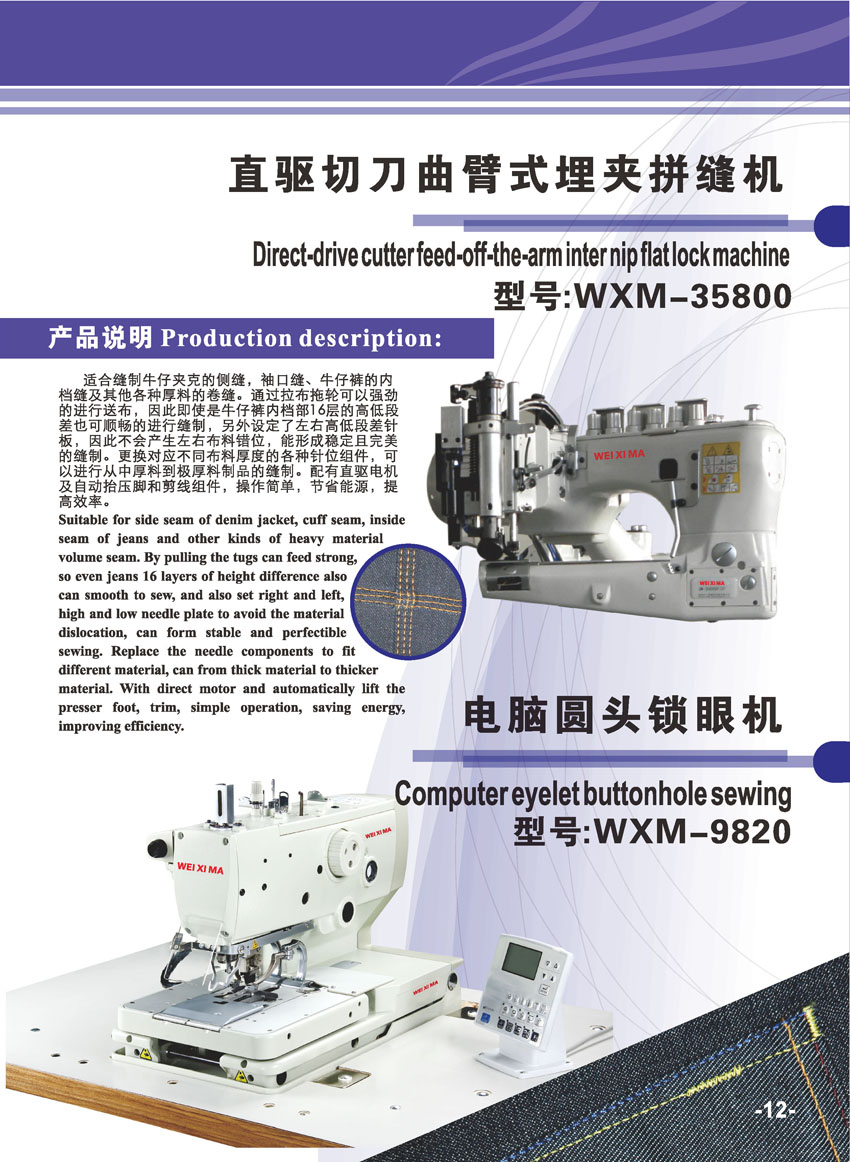 熱門產(chǎn)品: WXM1010G-V2 “威喜瑪”牛仔褲自動貼皮牌機   WXM 2516G-LV8 “威喜瑪”雙針雙色花樣機(手袋廠專用)   WXM2516G-V8F “威喜瑪”牛仔褲自動雙針雙色裝袋機(貼袋機)   威喜瑪(WXM-2516G-V6)牛仔褲單針自動貼后袋機(裝袋機)   WXM1010G-V3F 威喜瑪牛仔褲自動鈕牌(門襟)機