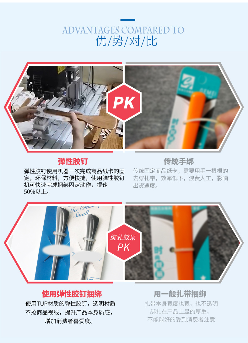 小五金、玩具、 廚具、家居用品等包裝固定。配合可調(diào)式膠釘機(jī)使用。