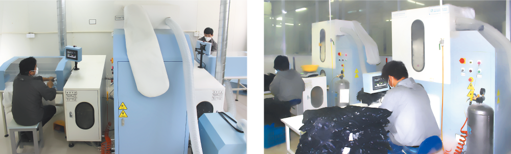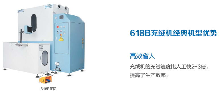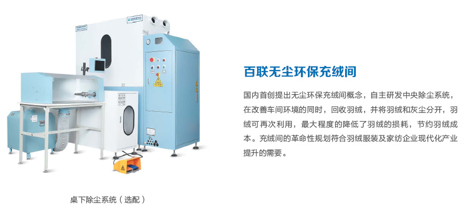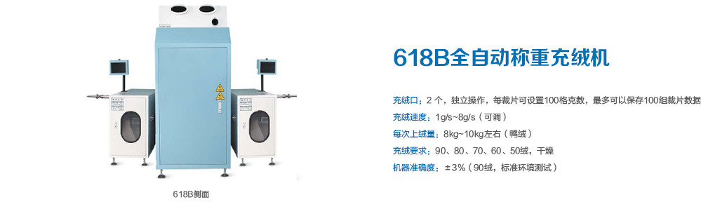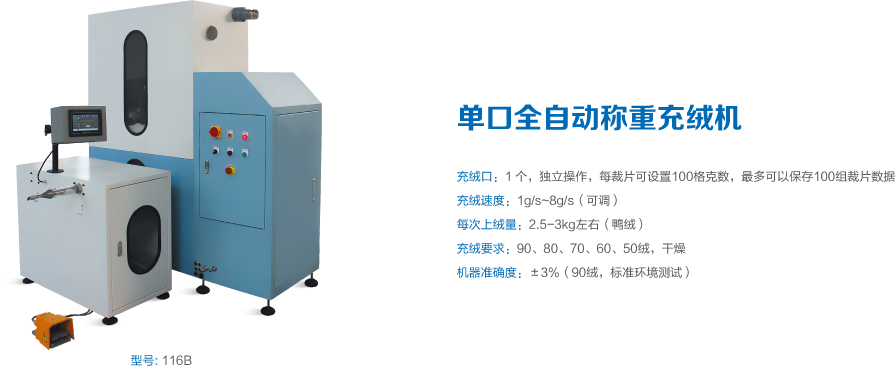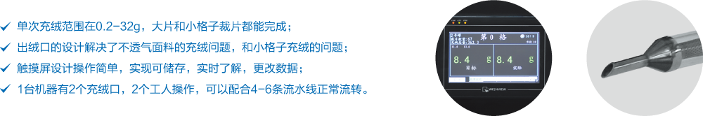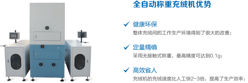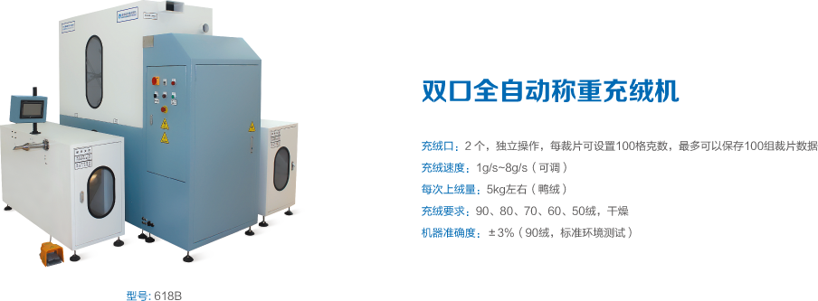 利用高壓氣體吸取羽絨,通過全自動稱重裝置,將設(shè)定克重的羽絨充入裁片。