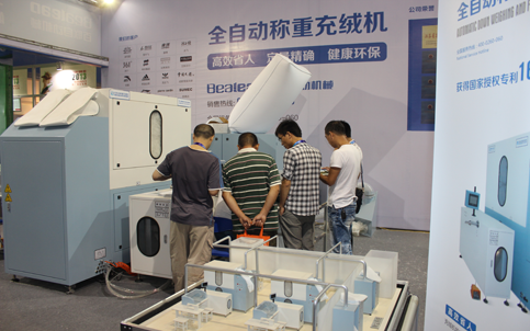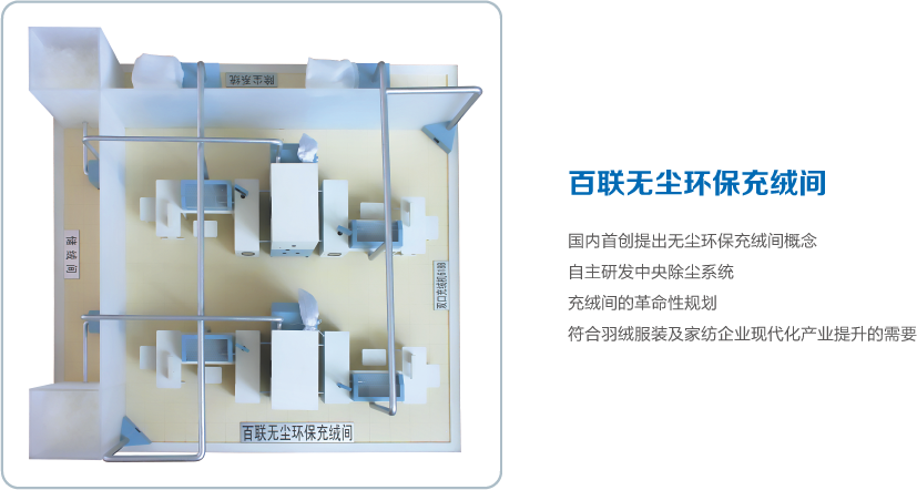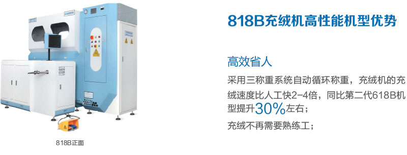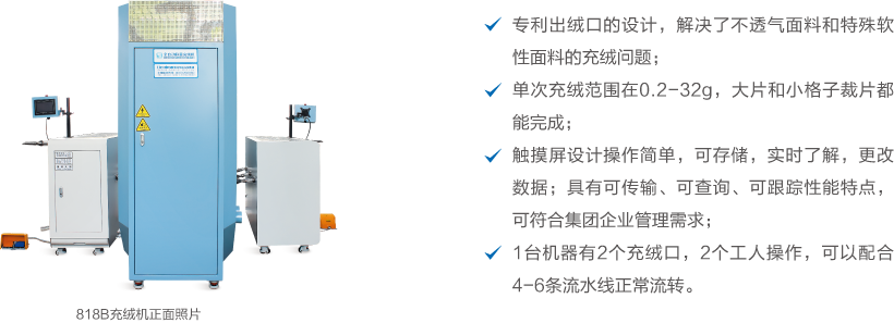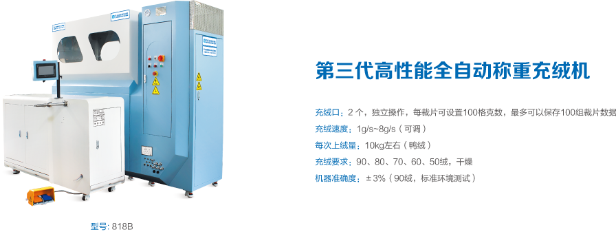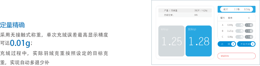 利用高壓氣體吸取羽絨,通過全自動(dòng)稱重裝置,將設(shè)定克重的羽絨充入裁片。