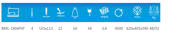 BML-1400系列為平臺(tái)式多針機(jī),上松緊、門襟滾條、上腰、裝飾縫等。適用于內(nèi)衣、運(yùn)動(dòng)服、女裝、工作服、室內(nèi)裝飾品等。 型號(hào): MR:打纜裝置 WB:上腰裝置 PSF:門襟裝置 PSM:裝飾裝置 PSSM:打纜和裝飾裝置 PL:滾條裝置 ET:下線為松緊線專用 附加裝置:MDH:前松緊帶送布調(diào)整裝置