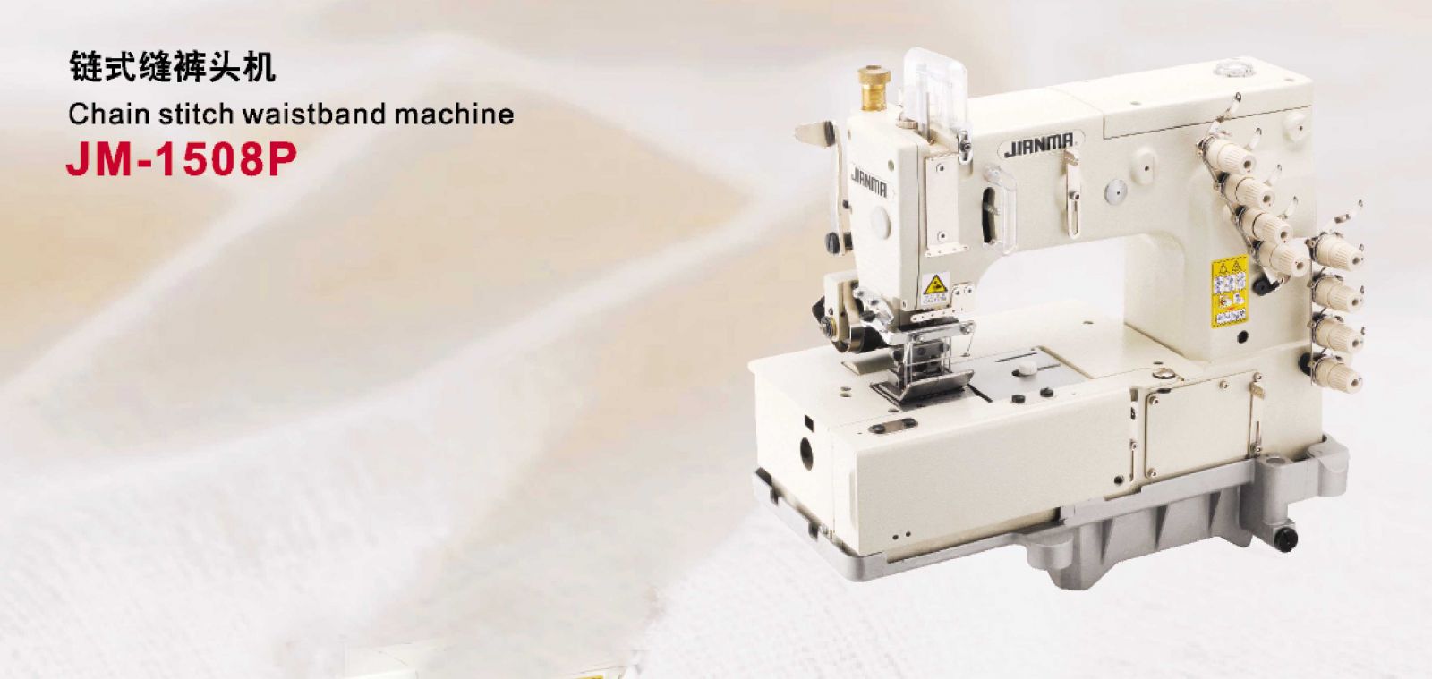 Lap seaming, attaching waistbands and line tapes,and inserting elastic. Major features of JM-1508 series are wide range of applications medium heavy and heavy weight fabric and special unique rear puller mechanism. These features enable JM-1508 series to produce durable and uniform stitches on medium and heavy weight fabrics.