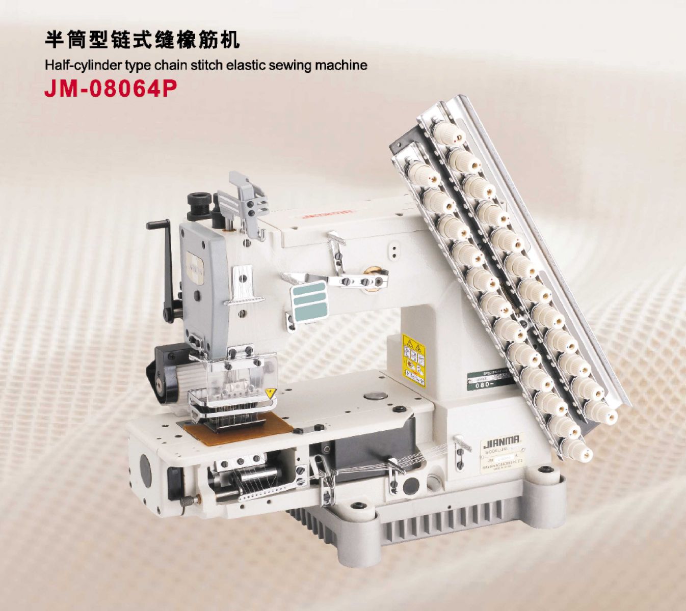 一般縫紉用十二針半筒型勾針縱向雙重鏈式縫紉機特點=完全自動給油,勾針縱向運動機械,筒型車臺,利于圄筒型衣物之縫紉,適用于高級衣物之裝飾車縫。