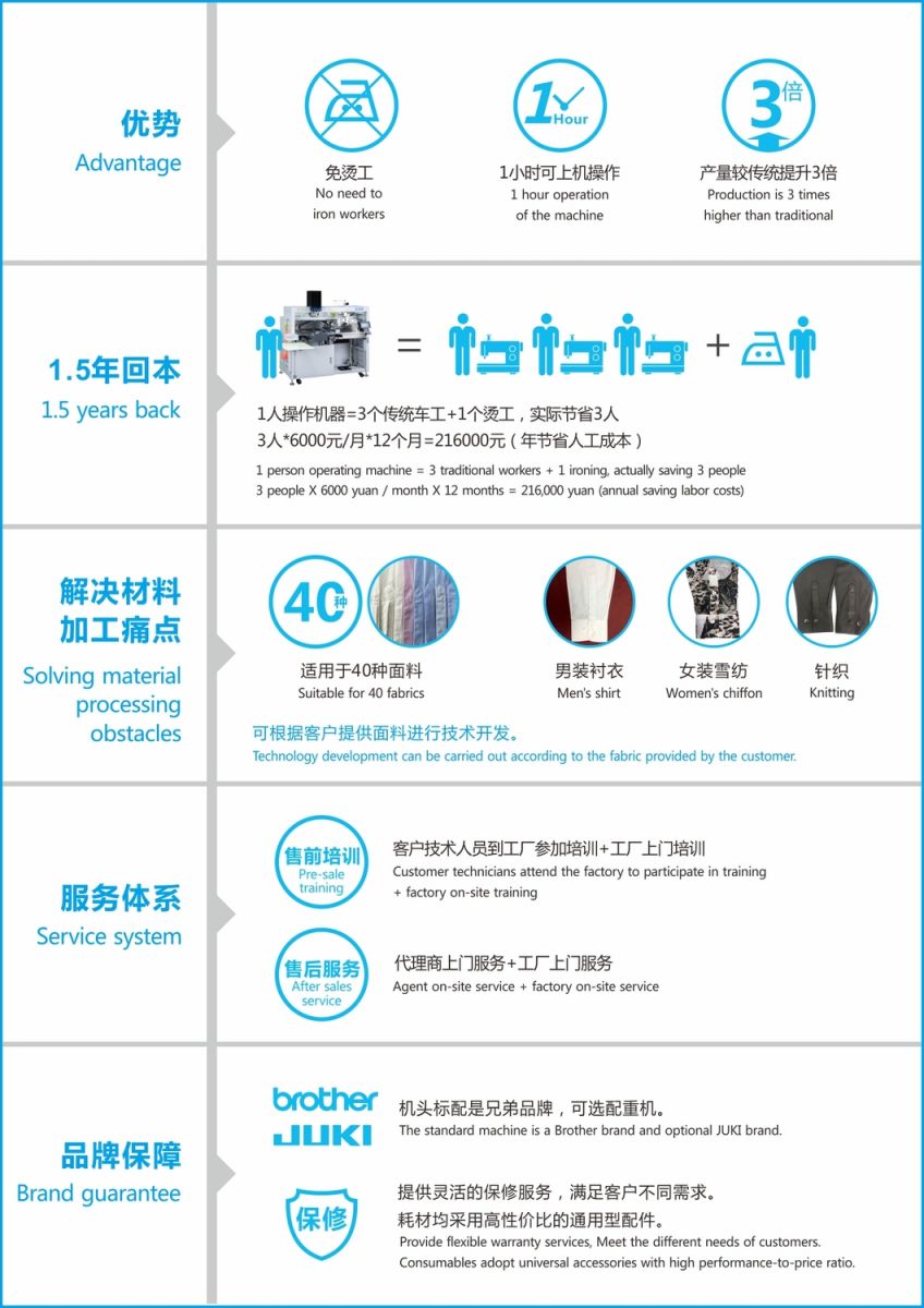 Unique suction system and automatic folding,grid-and-stripe device can complete the folding and fixing of the shape of the sleevefork at one time, so as to ensure the perfect fol ding effect and save the labor(2-3 people) who ironing the sleeve fork.