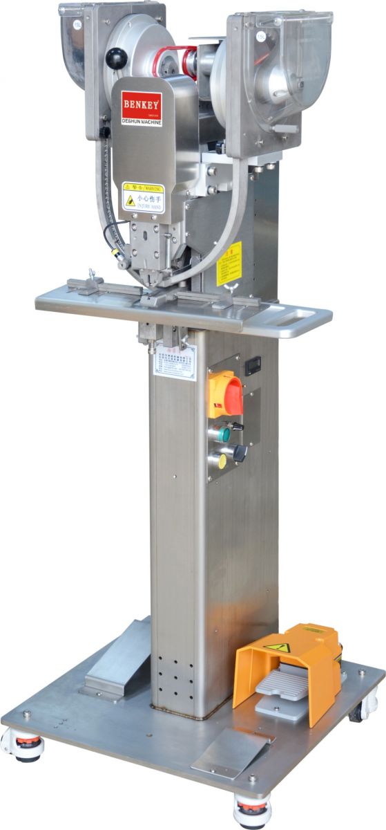 把鈕扣放進(jìn)對(duì)應(yīng)的2個(gè)料斗,開機(jī)會(huì)自動(dòng)轉(zhuǎn)動(dòng)料斗,自動(dòng)把鈕扣排滿軌道,自動(dòng)把鈕扣送到上下模具,伺服電機(jī)驅(qū)動(dòng),只要踩下踏腳開關(guān)便可裝訂自如,簡單易用。更換配件可以裝訂其它鈕扣。