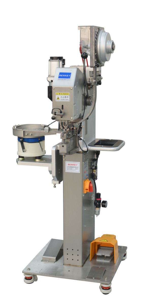 把鈕扣放進(jìn)對(duì)應(yīng)的2個(gè)料斗,開機(jī)會(huì)自動(dòng)轉(zhuǎn)動(dòng)料斗,自動(dòng)把鈕扣排滿軌道,自動(dòng)把鈕扣送到上下模具,伺服電機(jī)驅(qū)動(dòng),只要踩下晴腳開關(guān)便可裝訂自如,簡(jiǎn)單易用。更換配件可以裝訂其它鈕扣。
