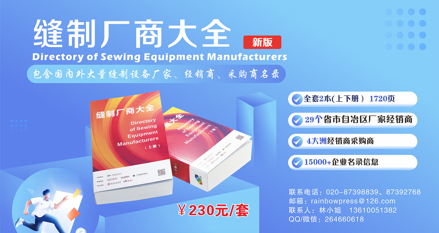另外,公司聯(lián)合廣東省縫制設(shè)備商會(huì)等單位出版了行業(yè)信息量最大的企業(yè)名錄--《縫制廠商大全》!犊p制廠商 大全》分為上、下冊(cè),共收錄了全國(guó)各省、市及港臺(tái)地區(qū)縫制設(shè)備生產(chǎn)企業(yè)及經(jīng)銷代理商名錄資料近8200家;另 外還收錄了亞洲各國(guó)縫制設(shè)備采購(gòu)商資料近1200家,南美、北美、歐洲、非洲及大洋洲縫制設(shè)備采購(gòu)商資料1200 多家。中國(guó)縫制機(jī)械協(xié)會(huì)理事長(zhǎng)田民裕為《縫制廠商大全》題序,序中提到:“《縫制廠商大全》的出版將是我 國(guó)縫制機(jī)械行業(yè)信息查詢工具多元化發(fā)展的又一補(bǔ)充,也填補(bǔ)了縫制設(shè)備行業(yè)黃頁(yè)類工具書(shū)籍的空白。《縫制廠商大全》涵蓋了國(guó)內(nèi)外各地的縫制設(shè)備廠商及采購(gòu)商名錄,其內(nèi)容全面、信息完整,是人們查閱、了解國(guó)內(nèi)外各地區(qū)行業(yè)廠商的重要工具書(shū)籍。”